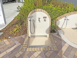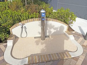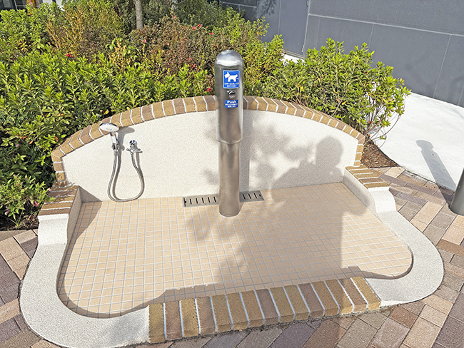 『足洗い』のハンドルを回すと、足元に水が流れてワンちゃんを立たせたまま足を洗い流すことができます。